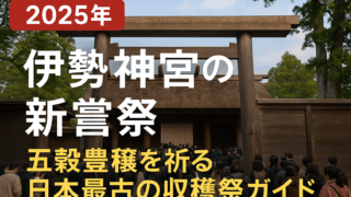 祭り 【2025年】伊勢神宮の新嘗祭|日本最古の収穫祭ガイド 日本には四季折々の豊かな行事がありますが、その中でも「新嘗祭(にいなめさい)」は特別な存在です。新嘗祭は、その年に収穫された新米を神々に奉り、自然の恵みに感謝する日本最古の収穫祭。毎年11月23日に全国の神社で行われますが、伊勢神宮の新嘗祭... 2025.10.02 祭り
