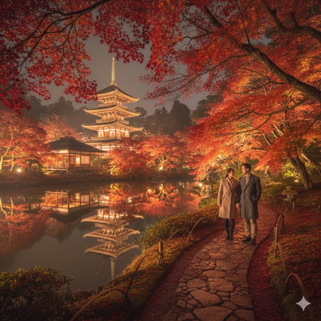 - 聴秋閣(ちょうしゅうかく)周辺: 三重塔を背景に紅葉の絶景を堪能できます。ライトアップで歴史的建築の陰影が浮かび上がり、非日常の静けさに包まれます。二人で立ち止まり、その荘厳な景色をじっくりと目に焼き付けてください。