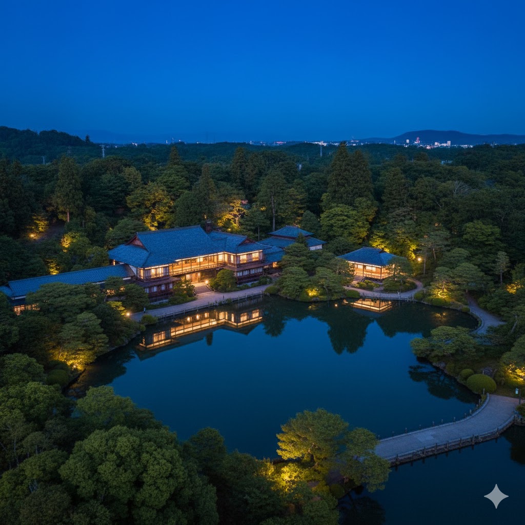 • 本館(数寄屋造り)柔らかな光に照らされ、木造の細部や侘び寂びが際立つ。訪問者は、軒下に近づき微かに香る木の匂いを感じながら、静かな時間を堪能できると報告しています。