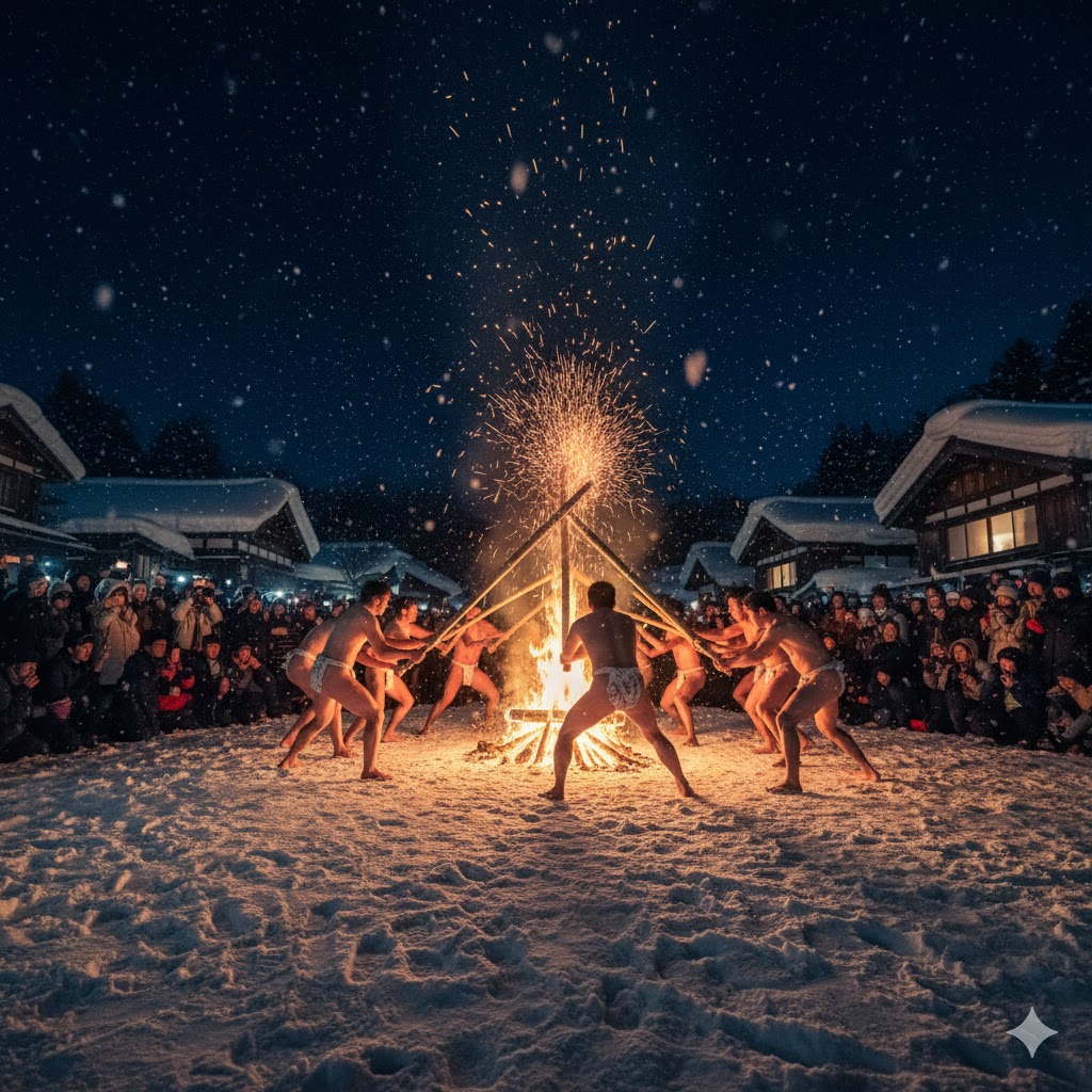 - クライマックス:激しい打ち合いを終えた後、割れ竹でご神火を打ち合い、火柱と火の粉が夜空に舞う「天筆焼き」が行われます。この壮絶な光景が、雪国の厳しい冬の夜に訪れる者に深い感動をもたらします。