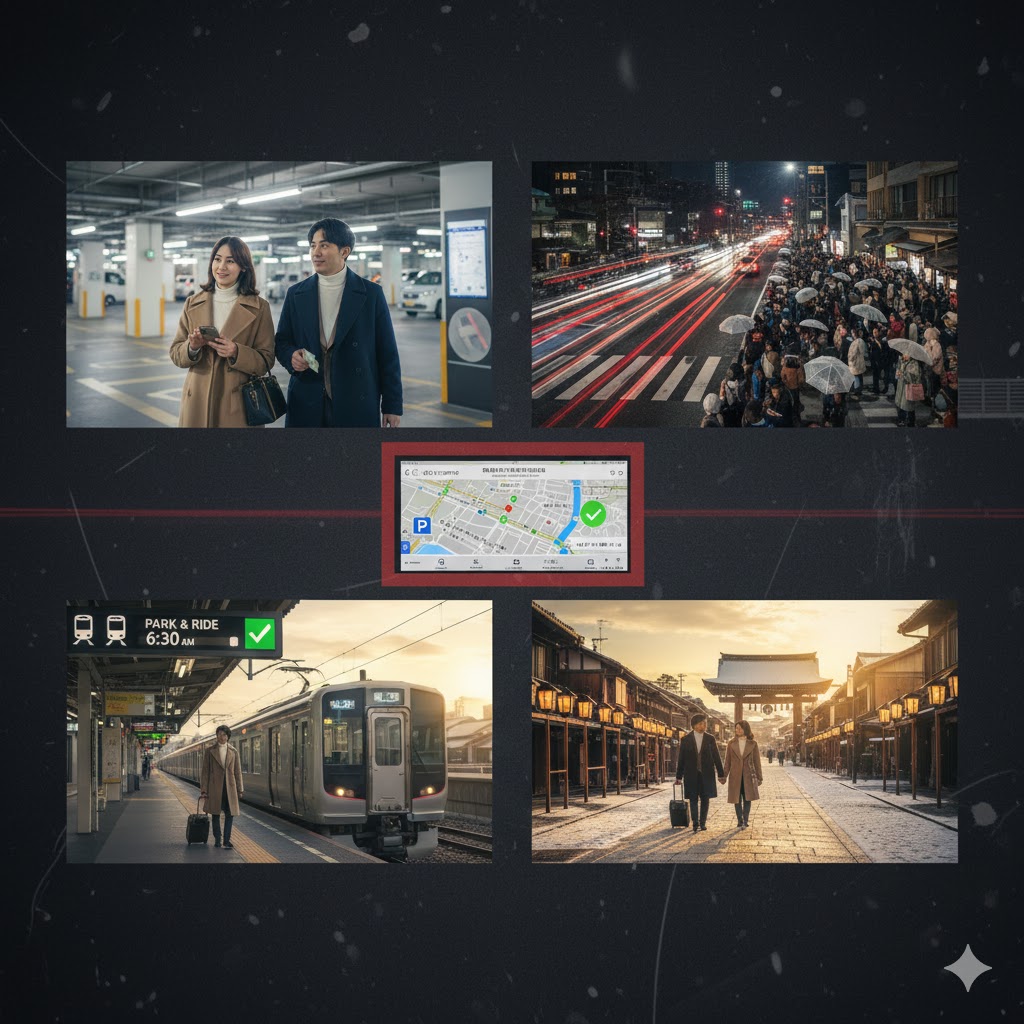 予約に失敗した場合や、市内の渋滞リスクを最小限に抑えたい場合に有効な裏技です。市内へ車で入らず、遠隔地を拠点とします。