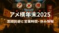 別記事で、【アメ横年末2025:混雑回避と営業時間 URL】→アメ横年末2025:混雑回避と営業時間・休み情報を参考にしていただければ幸いです。